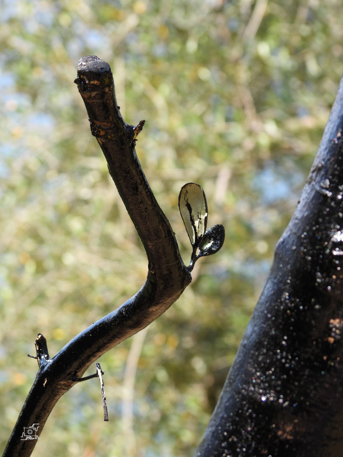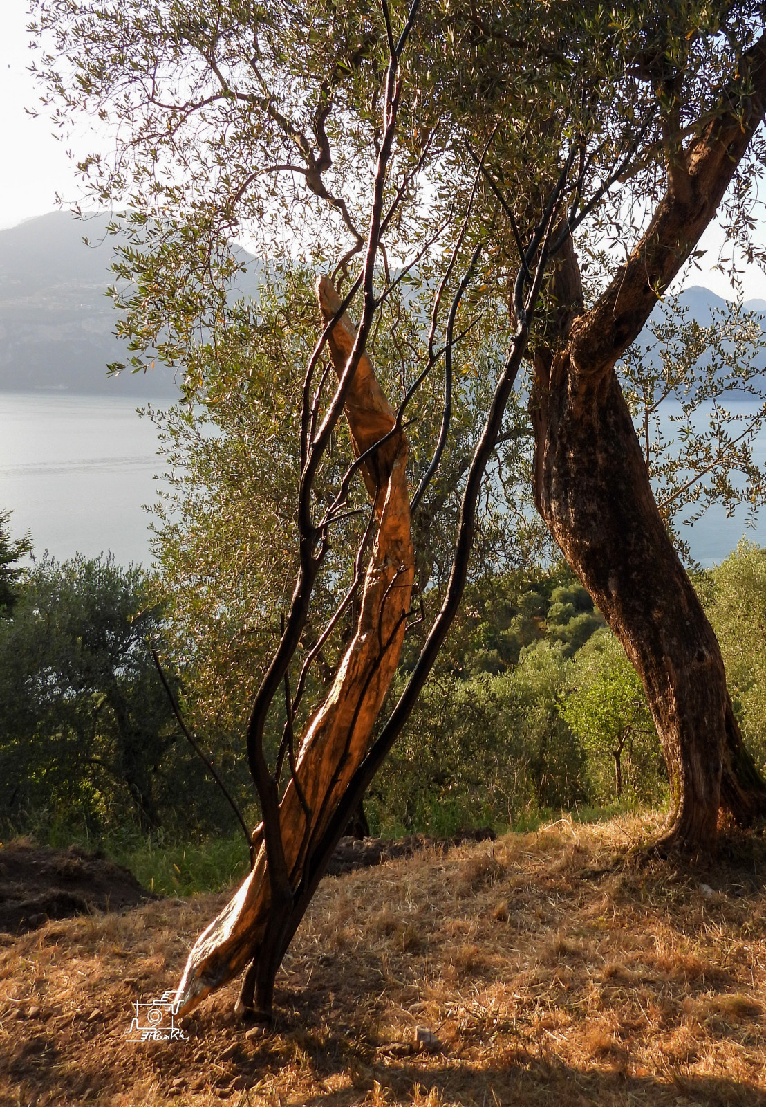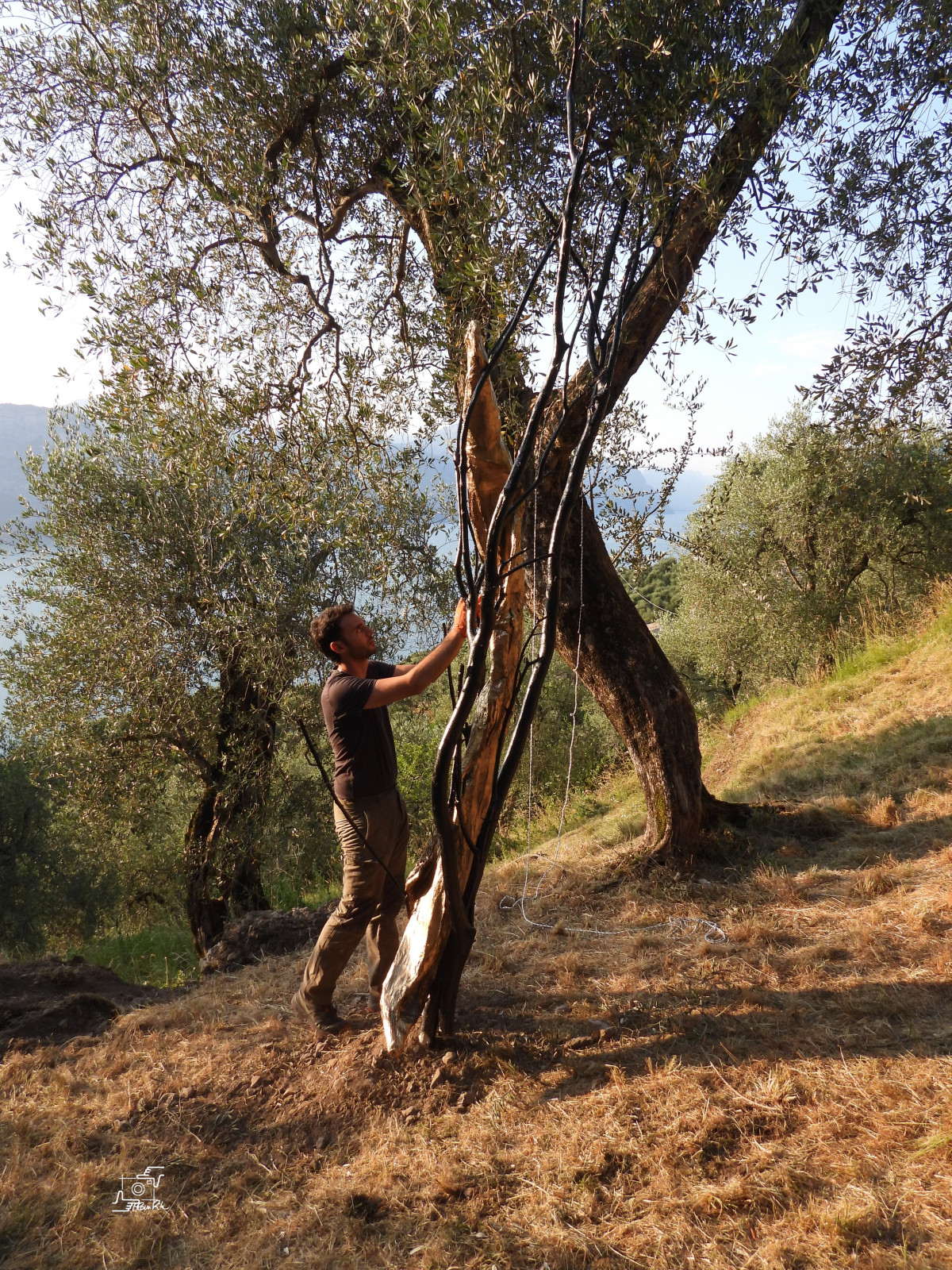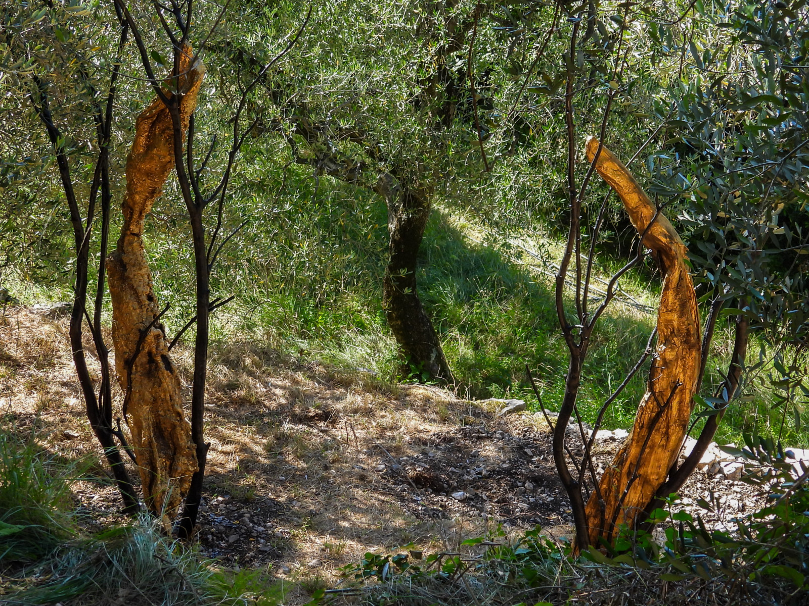 Tra gli ulivi secolari che punteggiano le colline terrazzate di Campo di Brenzone, si staglia “Forma Fluens” – la forma che fluisce – un’installazione site-specific di Emanuele Fasciani. L’opera, concepita per entrare in dialogo con la natura e il lento trascorrere del tempo nel paesaggio gardesano, è in perenne divenire. Si sviluppa come un intreccio ascensionale di rami anneriti e immersi nel bitume, materia arcaica e primordiale. I rami di ulivo, spogli di foglie, evocano forme nervose e organiche: scheletri vegetali, arterie fossilizzate, creature in cerca di una via d’uscita dal suolo, di una liberazione. A connettere questi elementi scuri, due forme dorate distinte, sospese e ramificate, realizzate in cera d’api. Modellate a mano in forme irregolari e fluide, la cera rappresenta la materia viva nel suo momento di transizione, ispirata ai processi alchemici di trasformazione. La struttura aurea richiama le nervature di un organo in mutazione o il calore liquido di una costellazione in formazione. La sua fragilità è palpabile: l’oro risplende, ma trema sotto la luce del sole, alla pioggia, al passaggio della vita.