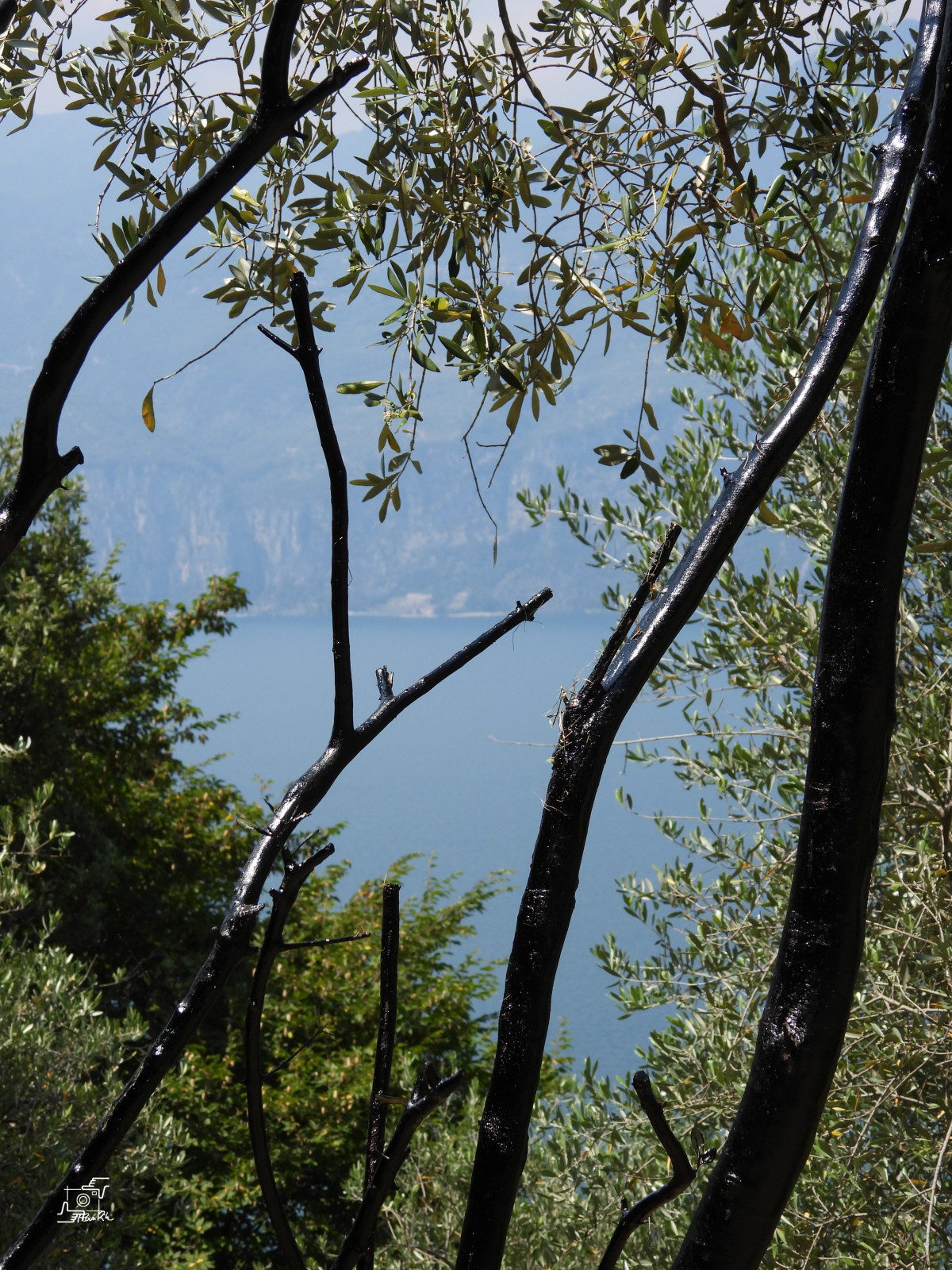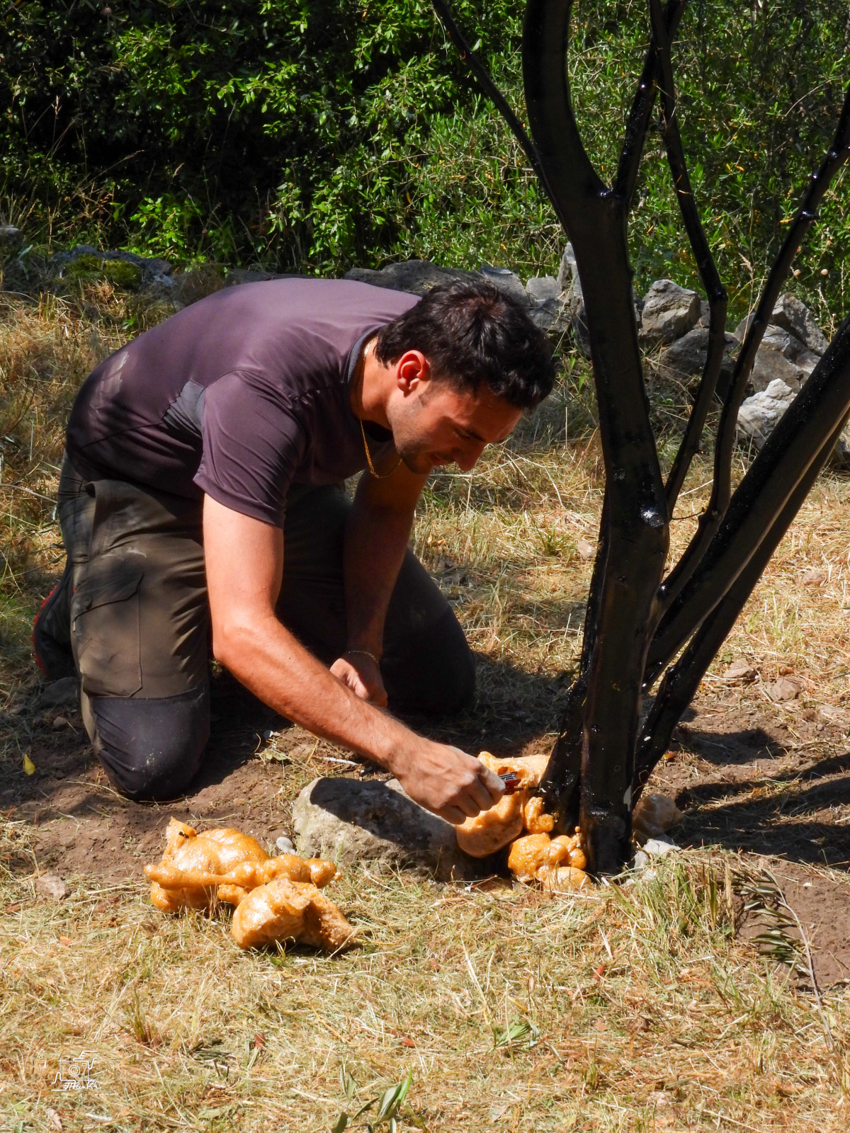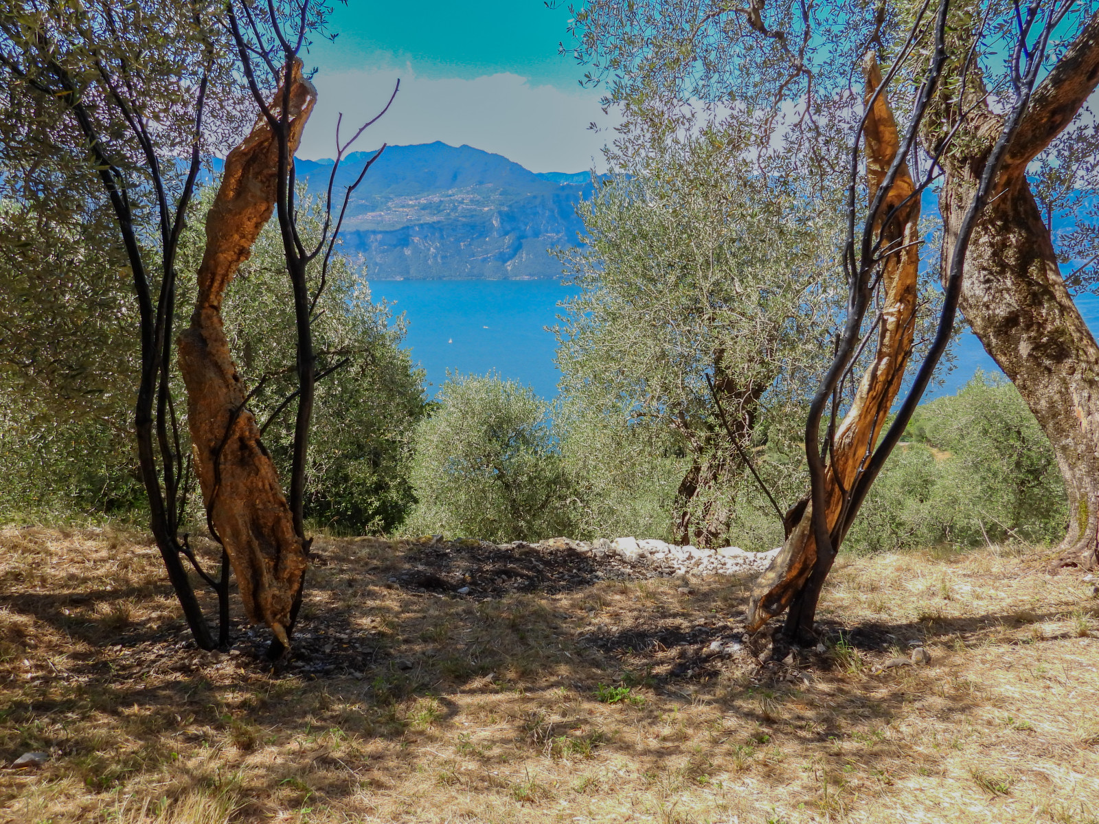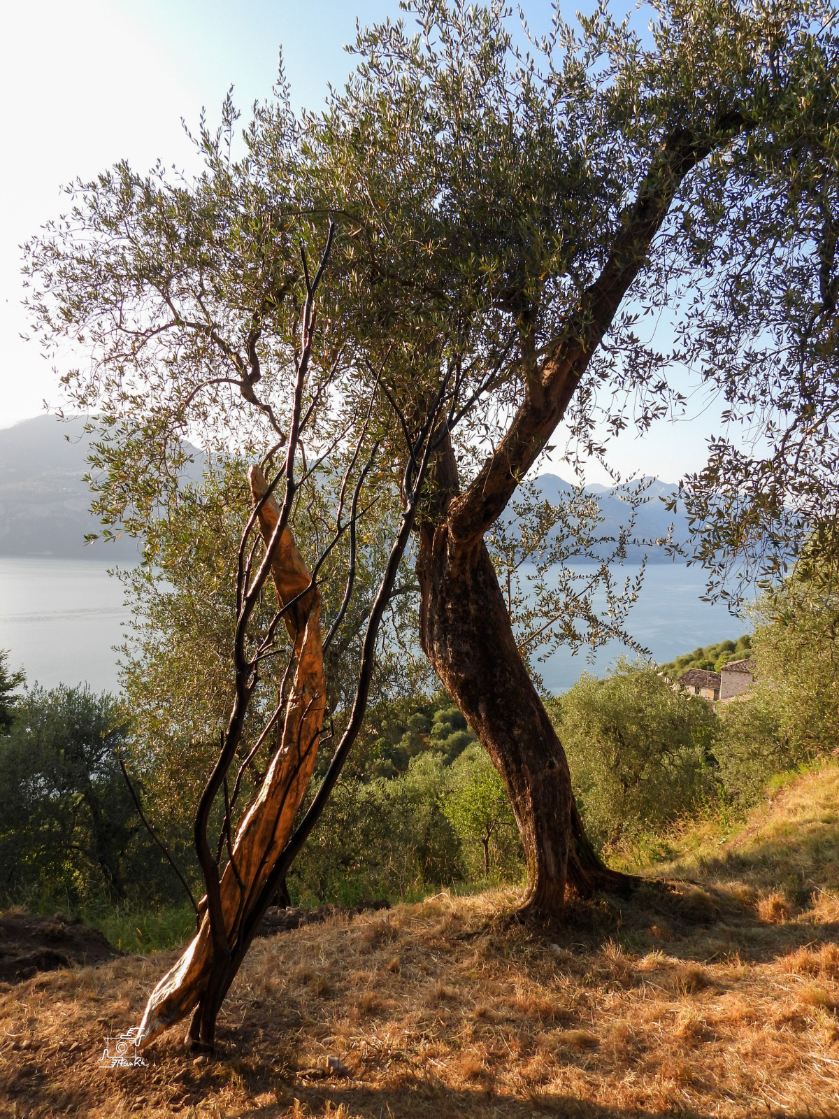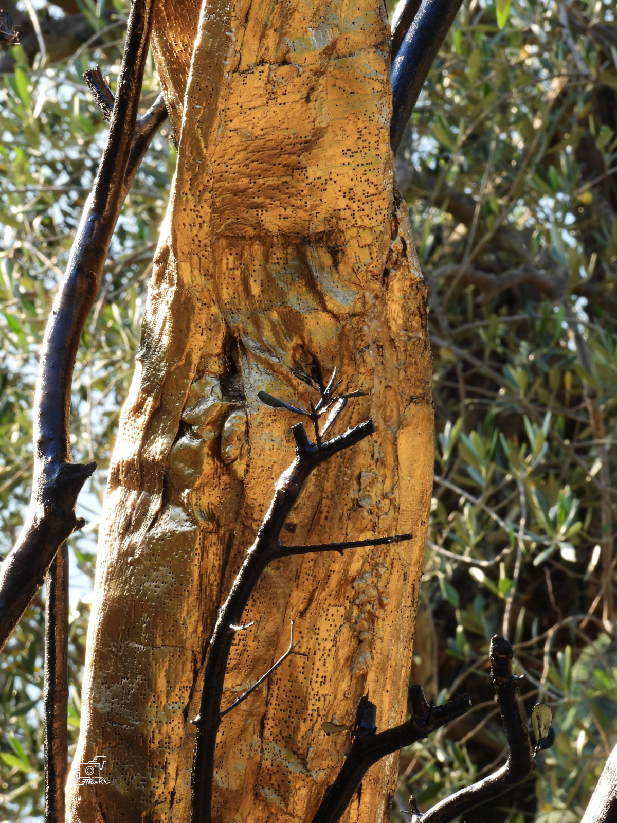 Tra gli ulivi secolari che punteggiano le colline terrazzate di Campo di Brenzone, si staglia “Forma Fluens” – la forma che fluisce – un’installazione site-specific di Emanuele Fasciani. L’opera, concepita per entrare in dialogo con la natura e il lento trascorrere del tempo nel paesaggio gardesano, è in perenne divenire. Si sviluppa come un intreccio ascensionale di rami anneriti e immersi nel bitume, materia arcaica e primordiale. I rami di ulivo, spogli di foglie, evocano forme nervose e organiche: scheletri vegetali, arterie fossilizzate, creature in cerca di una via d’uscita dal suolo, di una liberazione. A connettere questi elementi scuri, due forme dorate distinte, sospese e ramificate, realizzate in cera d’api. Modellate a mano in forme irregolari e fluide, la cera rappresenta la materia viva nel suo momento di transizione, ispirata ai processi alchemici di trasformazione. La struttura aurea richiama le nervature di un organo in mutazione o il calore liquido di una costellazione in formazione. La sua fragilità è palpabile: l’oro risplende, ma trema sotto la luce del sole, alla pioggia, al passaggio della vita.