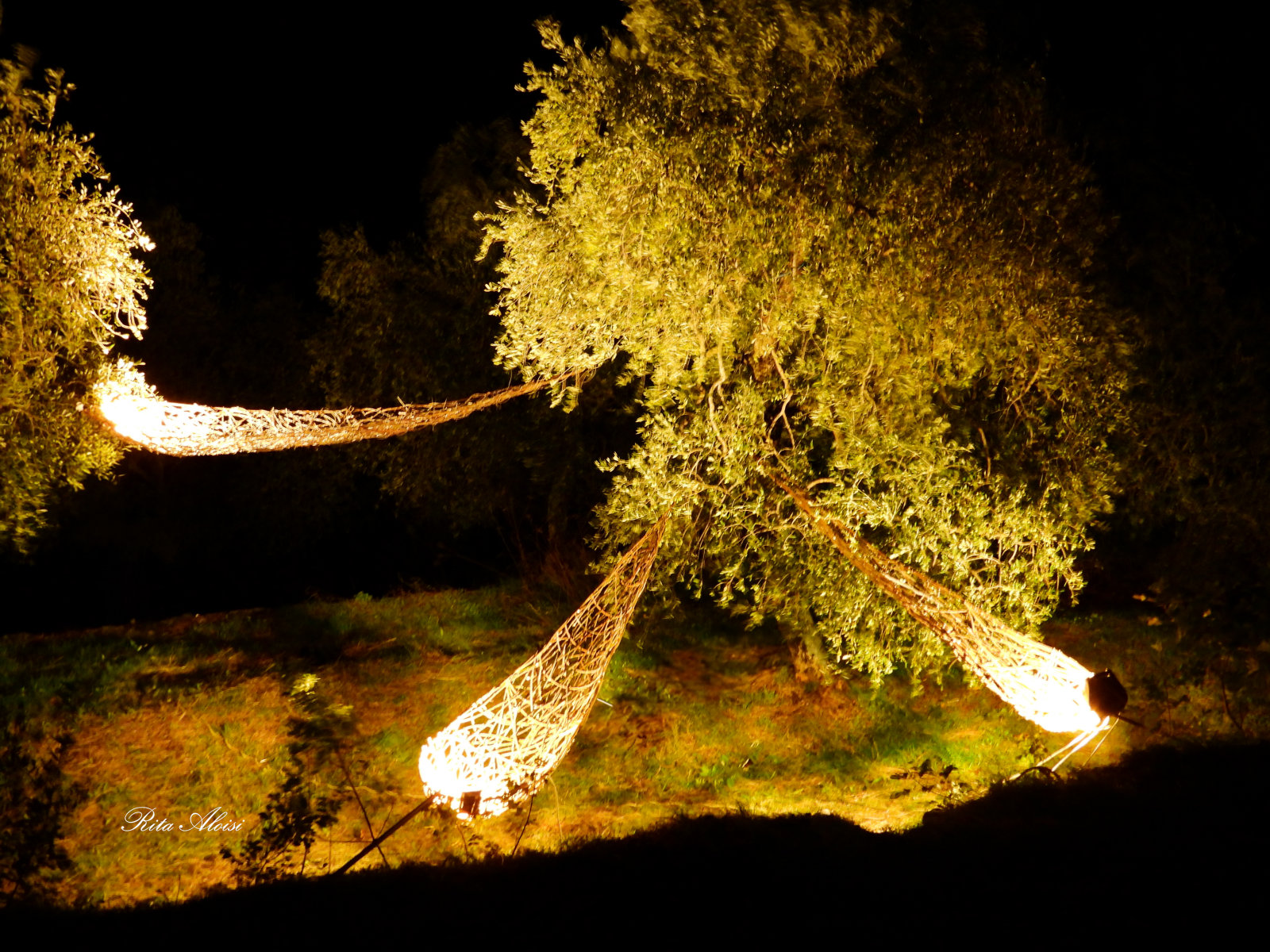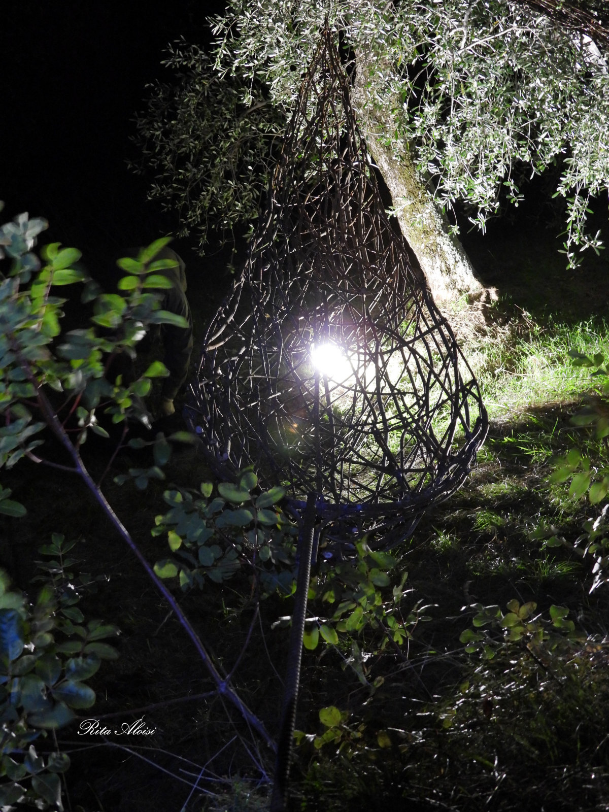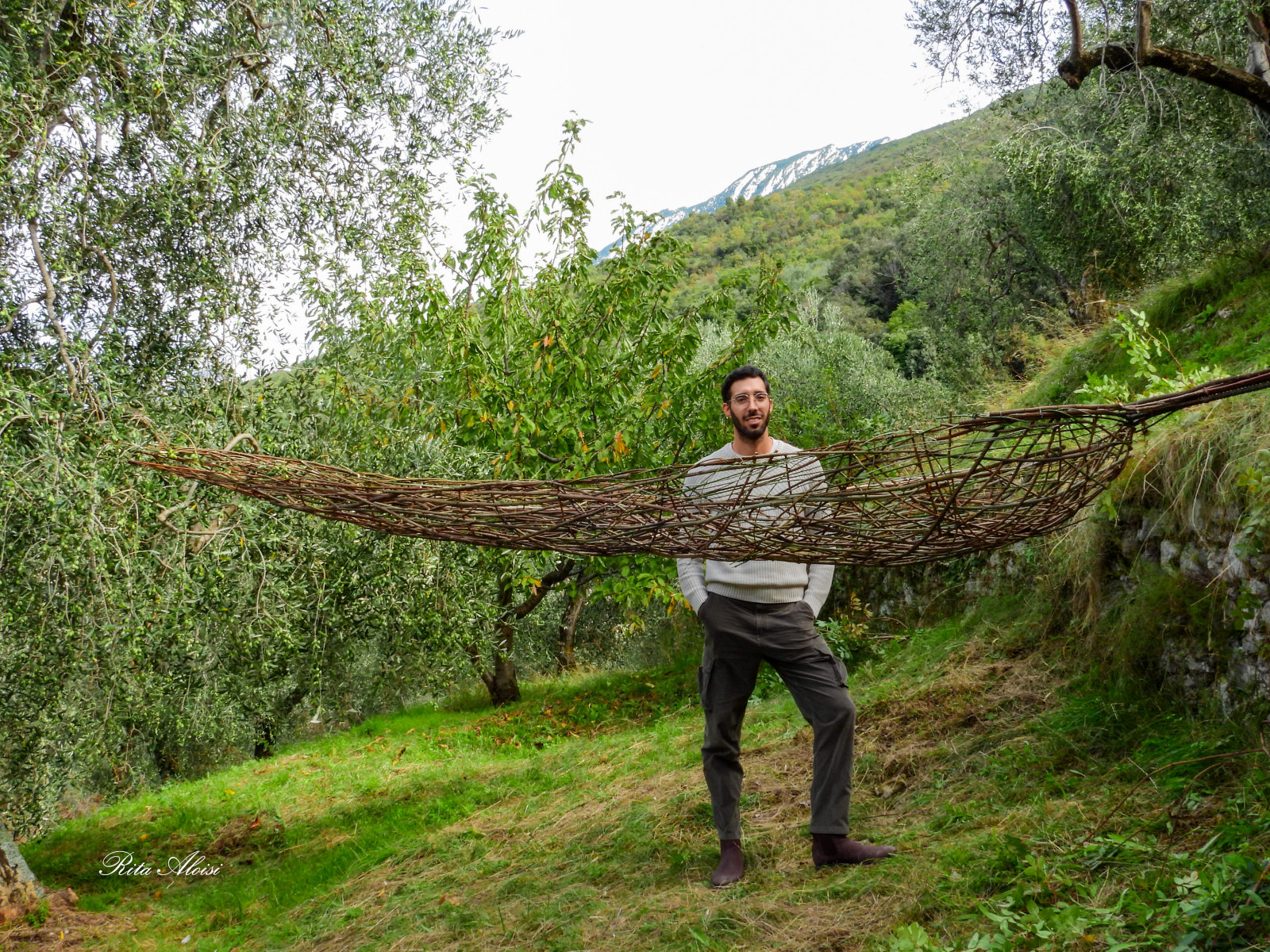 To represent the trait d'union, an olive leaf that transforms into a boat that floats and glides among the ancient trees. The audience is invited to view the work from different angles, gaining new perspectives and projecting the object into different landscapes—both mountains and lakes. The work floats, raised from the ground, to illustrate the dream, the dreamlike journey of a thought that hovers above us, changing according to human will. Martin Heidegger said, "Man is thrown into the world, and in this suspended state he seeks the meaning of his being." This philosophy is transformed into a work for the artist, who wishes to materialize a thought by giving it the simplest form that expresses the nature of the place.