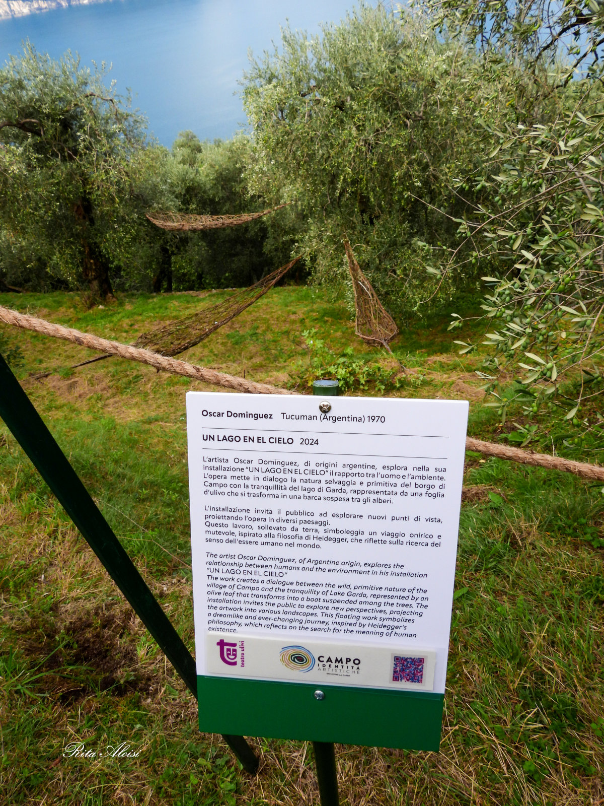 The artist himself embodies the type of person who is constantly searching for a profound meaning of life in relation to the environment around him. Thus, in his installation "UN LAGO EN EL CIELO," the Argentinian artist Oscar Dominguez seeks to establish a dialogue with the territory, connecting the raw, wild, and original aspect of the village of Campo with the calm, sinuous, and gentle waves of Lake Garda.